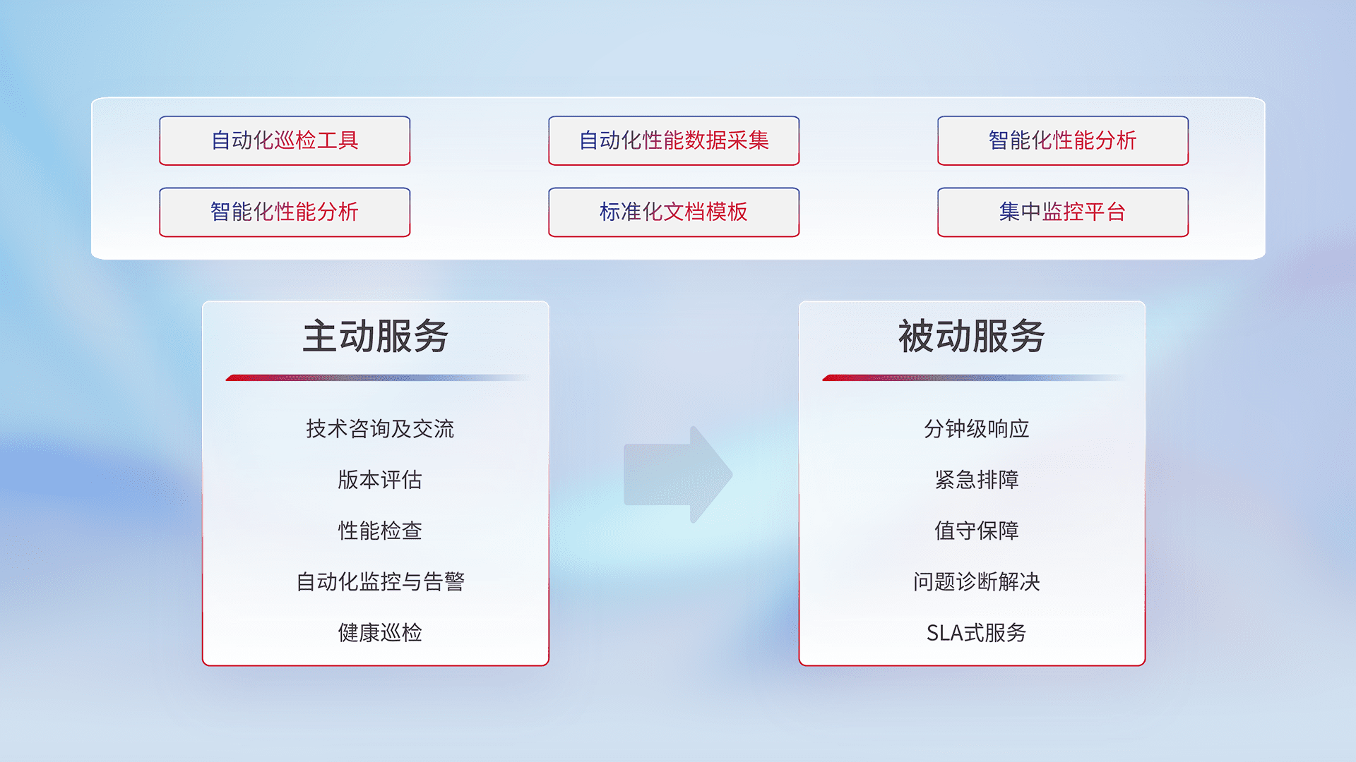智能化工具和标准化文档,,保障服务质量,,,,提供主动服务(包含技术咨询、、、版本评估、、性能检查、、、自动化监控与告警、、健康巡检)和被动服务包含(分钟级响应、、、、紧急排障、、值守保障、、问题诊断解决、、、SLA服务)。。。